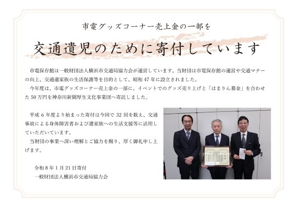 市電保存館グッズショップ売上金の一部とコンビニ店舗等に常設している『はまりん募金箱』への寄付金を福祉支援団体に寄託しています。